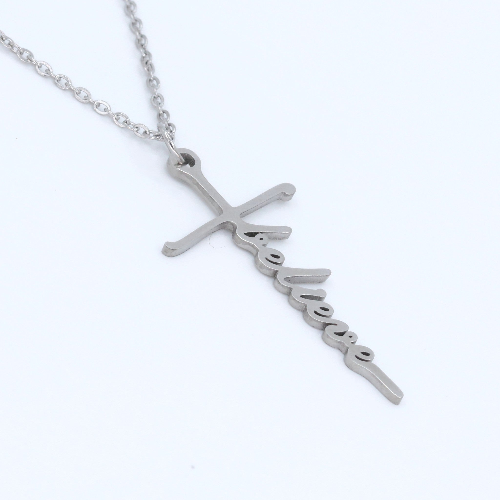 Hierdie elegante silwer halssnoer het 'n pragtig vervaardigde kruis met die woord "Believe." Dit dien as 'n subtiele dog kragtige herinnering aan geloof en innerlike krag.